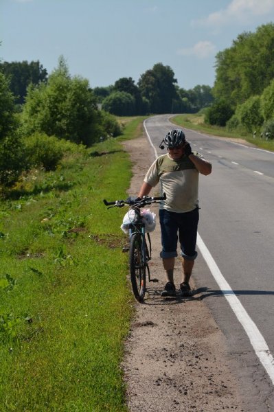 The beginning of the ride was wonderful. Overcast skies kept temps comfortable; Sunday traffic out of Kaluga was light and the first 40km was on smooth, almost track like surfaces. Then, a loud “pop!” Rear tire suffered a full blow out. On inspection, the treads had starting pulling away from the wire bead. I replaced the tube hoping the tire would hold even though there was a definite bulge. Unfortunately, another 20km up the road (this time on the busy motorway) the tube exploded. Gear guru Sheldon Brown explains that this type of problem can be temporarily fixed by covering the rip but since I’m carrying a folding spare, I just swapped that out (very carefully watching out for large trucks on the small shoulder). Will need to go rubber shopping in Moscow.