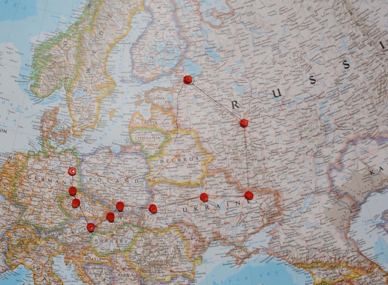 As captured on my wall prior to departure, the proposed itinerary is: Berlin, Dresden, Prague, Vienna, Zilina, Auschwitz, Krakow, Lviv, Kiev, Kharkiv, Moscow, Veliky Novgorod, Saint Petersburg. As the google map flies, this itinerary would encompass ~4000km. But, one of the trip goals is to keep planning to a minimum and allow conditions, strange encounters and whims to influence the route. So, you’ll have to check back in to determine how actual results compare.