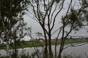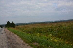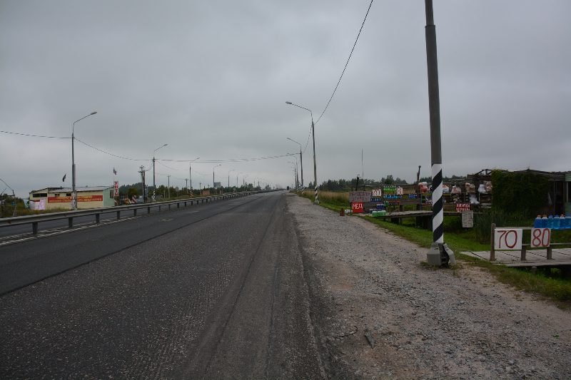 I got a few river glimpses and passed some large shipyards (St Petersburg/Leningrad was the center of USSR shipbuilding activities) however the road was anything but a cruise. A busy two-lane road with narrow lanes, no shoulder and lots of trucks. Cars had no problems passing me but several times large trucks came very close to brushing and pinching me off of the road. A few honked angrily but I just ignored them and stuck to my little patch of pavement. Then, several loud toots from a truck who (based on sounds) was pretty far behind me but moving fast. He kept honking and I finally peeked over my shoulder to see a blue cab with large grey trailer bearing down on me at high speed! I guess the honking was his idea of courtesy since it didn’t appear he planned to take any evasive action. My peek caused a slight swerve and I knew I was in trouble. As the truck passed he gave me a heavy brush focused on the left rear pannier. It wasn’t enough to knock me over, and I immediately coasted off the road to a stop to assess the damage. The truck didn’t stop to check on me and I was so bewildered I didn’t even get a chance to give an angry gesture. No other vehicles stopped either and I’m going to conclude that Saint Petersburg drivers are the worse in all of Europe/Russia.