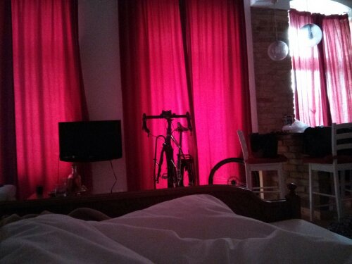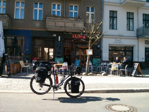 Just a day trip from Berlin to Potsdam to check out the bike and get a sense of the road. I followed a part of the Euro Cycling route R1 (aka German Route D3) which hits a number of iconic spots in Berlin (Brandenburg Gate, Reichstag, Olympic Stadium) before heading west through a forest and lake region and terminating in Potsdam proper. Cycling is mostly on urban bike lanes before hitting a nice 20km stretch of winding forest roads that reminded me of Vermont spring rides. I passed (or more appropriately, was passed by) many road weenie cyclists including a mini-Peloton.