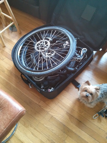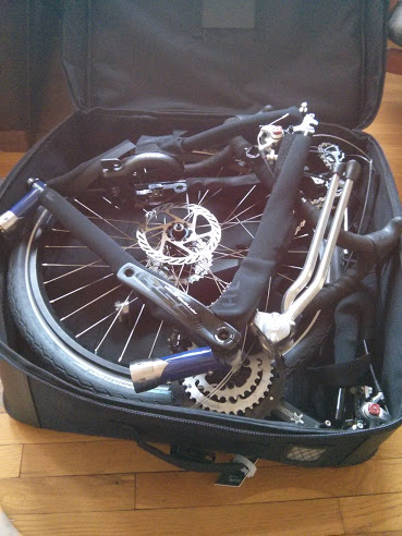 After placing padding on all painted surfaces in attempts to limit cosmetic damage, carefully stack and interlace the pieces into the carrying case (in this instance, the Co-Pilot wheeling case). From bottom to top, I opted to pack in this order: front triangle (with handlebars removed but cables intact), rear wheel cassette down, rear triangle, handlebars wedged into place, front wheel. Next, smaller accessories (lights, axles, tools, etc) can be stuffed into available spots along with a large number of extremely cheap Target towels for padding.