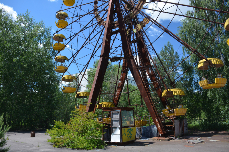 Pripyat, the largest city in the zone with pop. ~50,000 in 1986, is only 3km from the Chernobyl plant and was built in 1970 to house the Chernobyl workers. It was only inhabited for a short 16 years before being mass evacuated two days after the reactor suffered partial meltdown. The buildings remain as a ghost town (although most of the human belongings were looted in the 90s when USSR collapsed), and Pripyat is the site of an iconic Amusement Park and Ferris Wheel (featured in nearly full detail in Call of Duty 4 among many music videos, films, etc) which never reached its planned grand opening on May 1, 1986 five days after the disaster.